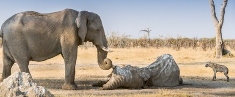 Elephant protects another's body from predators