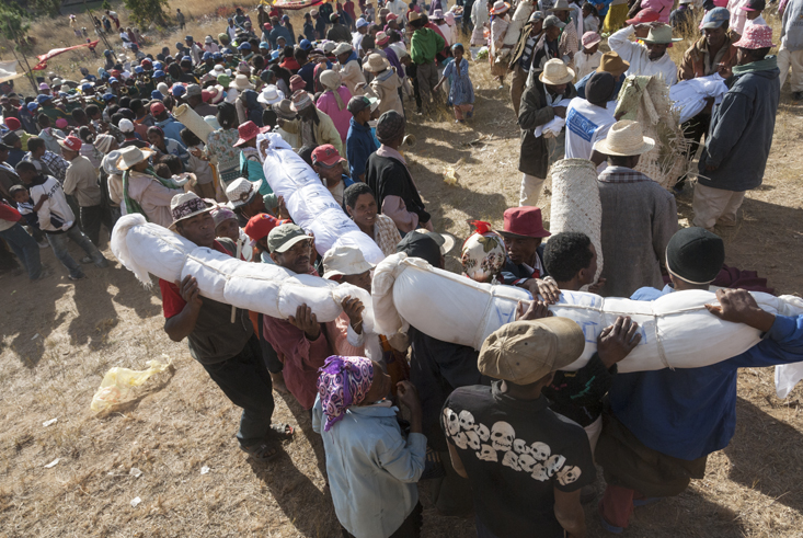 During “famadihana,” which occurs every two to seven years, the families of the dead host a glorious celebration at the ancestral crypts. Each body of a loved one is removed from the tombs, embalmed and wrapped in fine silk or straw floor mats. The corpses are then sprayed with expensive perfume and occasionally splashed with wine.