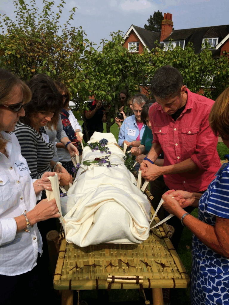 Wrapping a loved one in a shroud is a deeply personal and emotional experience, so it’s important to take time and allow yourself to fully be present in the process. Practicing the processes outlined here can be helpful in allowing preparation for the actual shrouding process prior to burial or cremation. Many people have found that practicing with a relative or a friend can make it easier to understand what to expect. Asking a funeral director or home funeral guide for help is also greatly encouraged, along with referencing tutorials or workshops for further guidance.