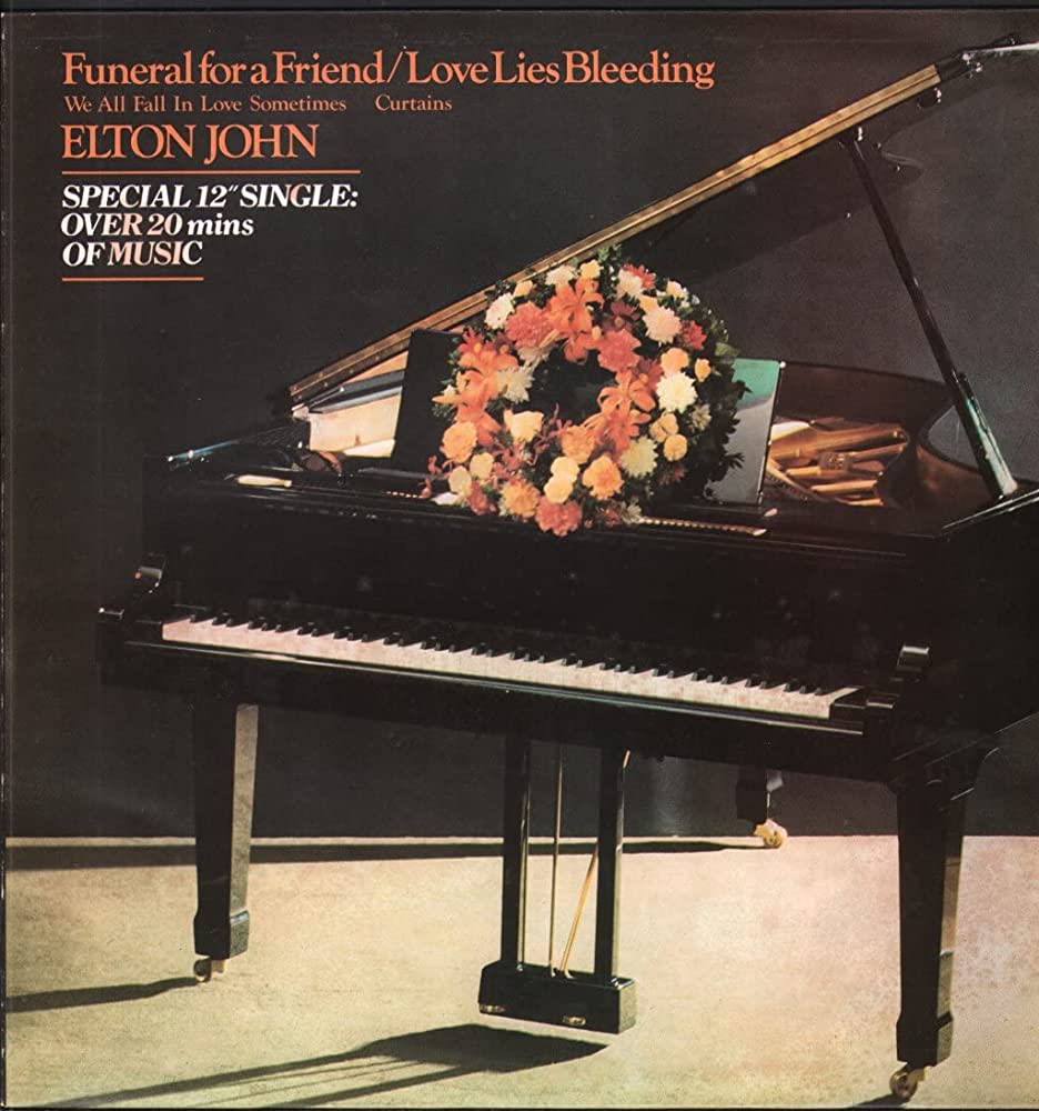 John wrote “Funeral for a Friend,” a slightly more melancholy — if still rock ‘n’ roll — instrumental piece, when contemplating the sort of music he’d like at his funeral. “Love Lies Bleeding,” an upbeat follow-up with John on piano, accompanied by drums, guitar, bass and synthesizer, contrasts with the dire nature of its lyrics. It begins: