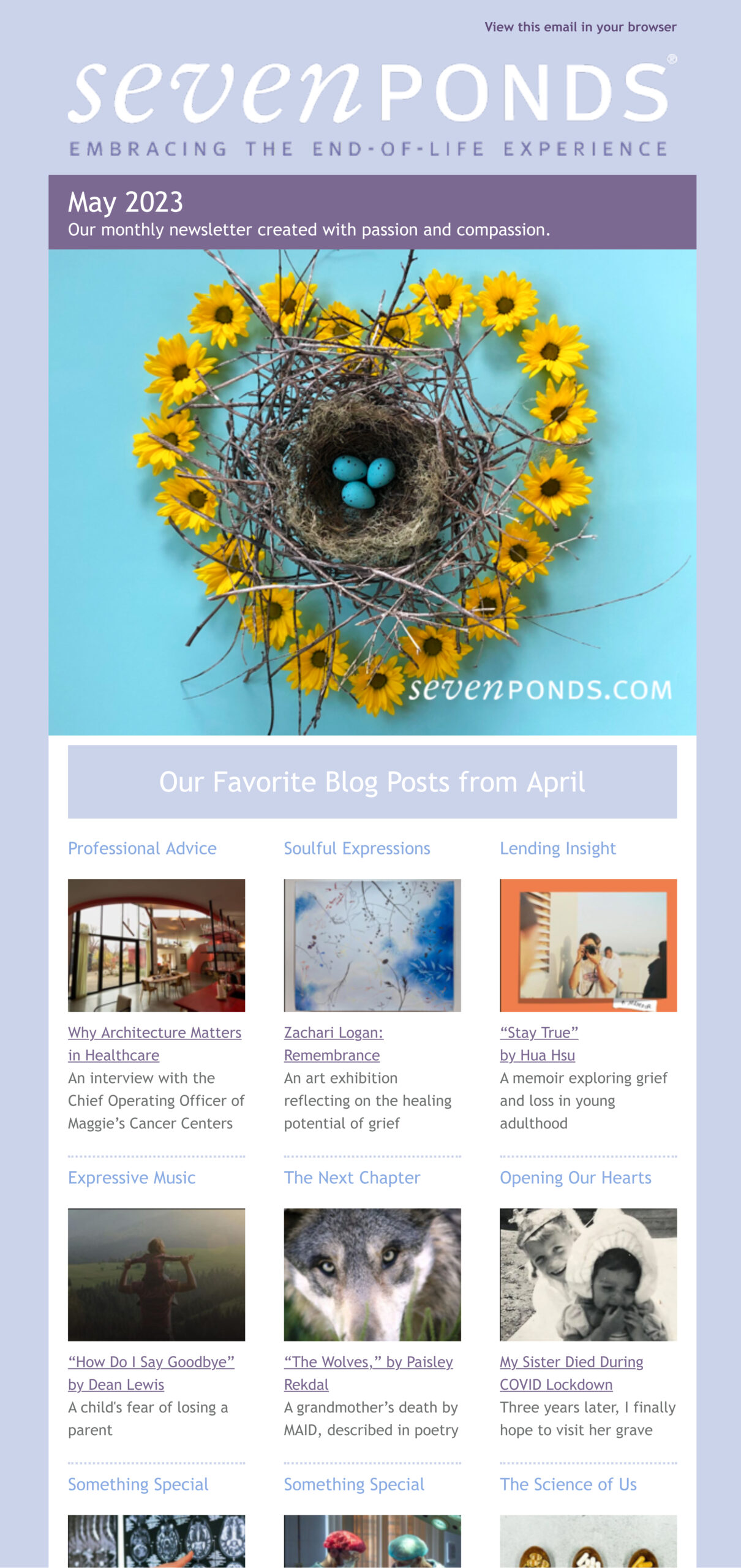 Founded in 2011 by Suzette Sherman, SevenPonds was sparked by the uplifting way her Swiss grandmother, Ida, chose to face death. In their final phone conversation, Suzette was deeply moved by Ida’s giddy, joyful spirit—a powerful moment that revealed the emergence of a new, hopeful perspective on dying.