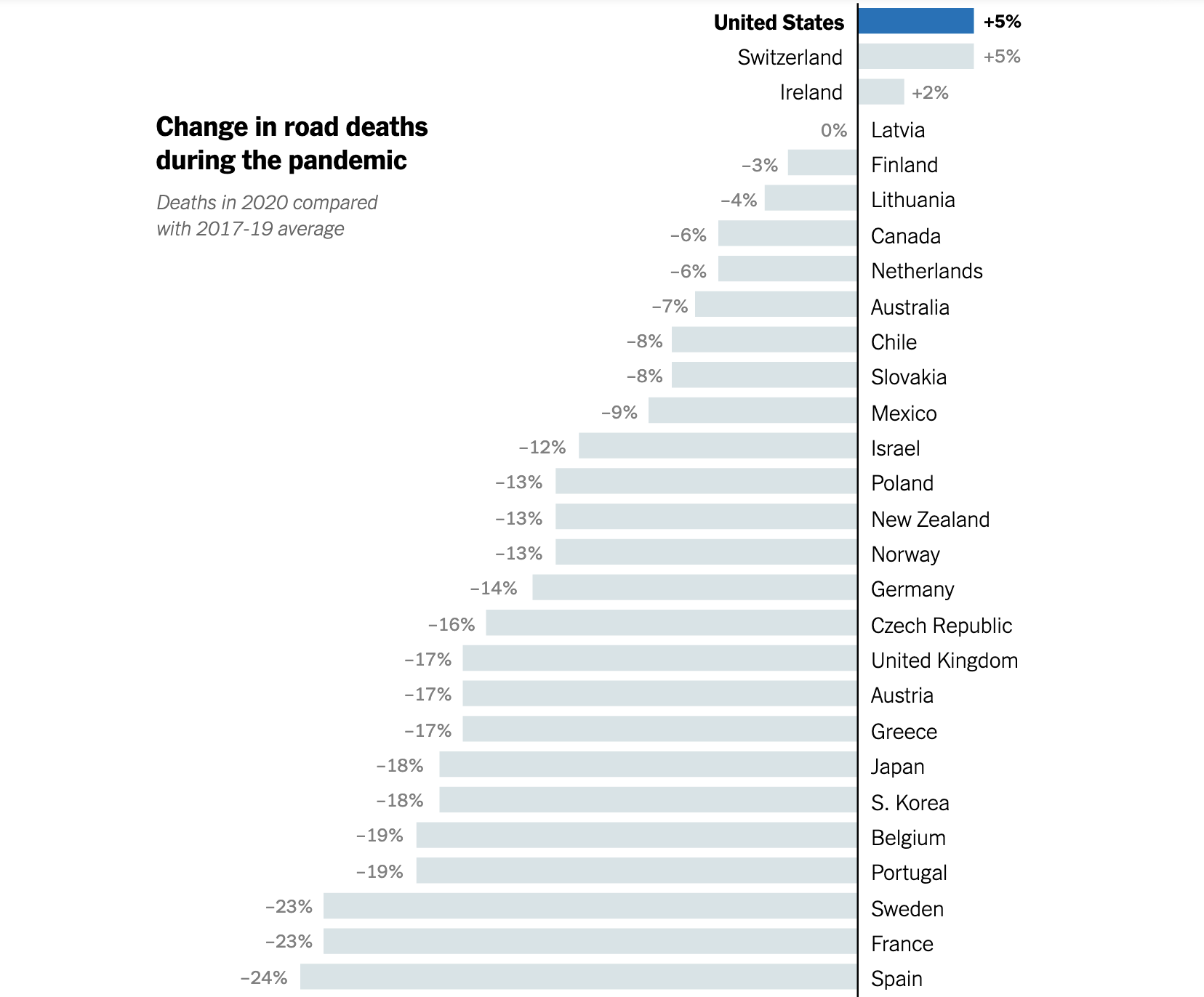 Traffic deaths actually rose from 2019 to 2020 as well. In fact, the United States was one of only three wealthy countries to see an increase in traffic deaths in 2020.