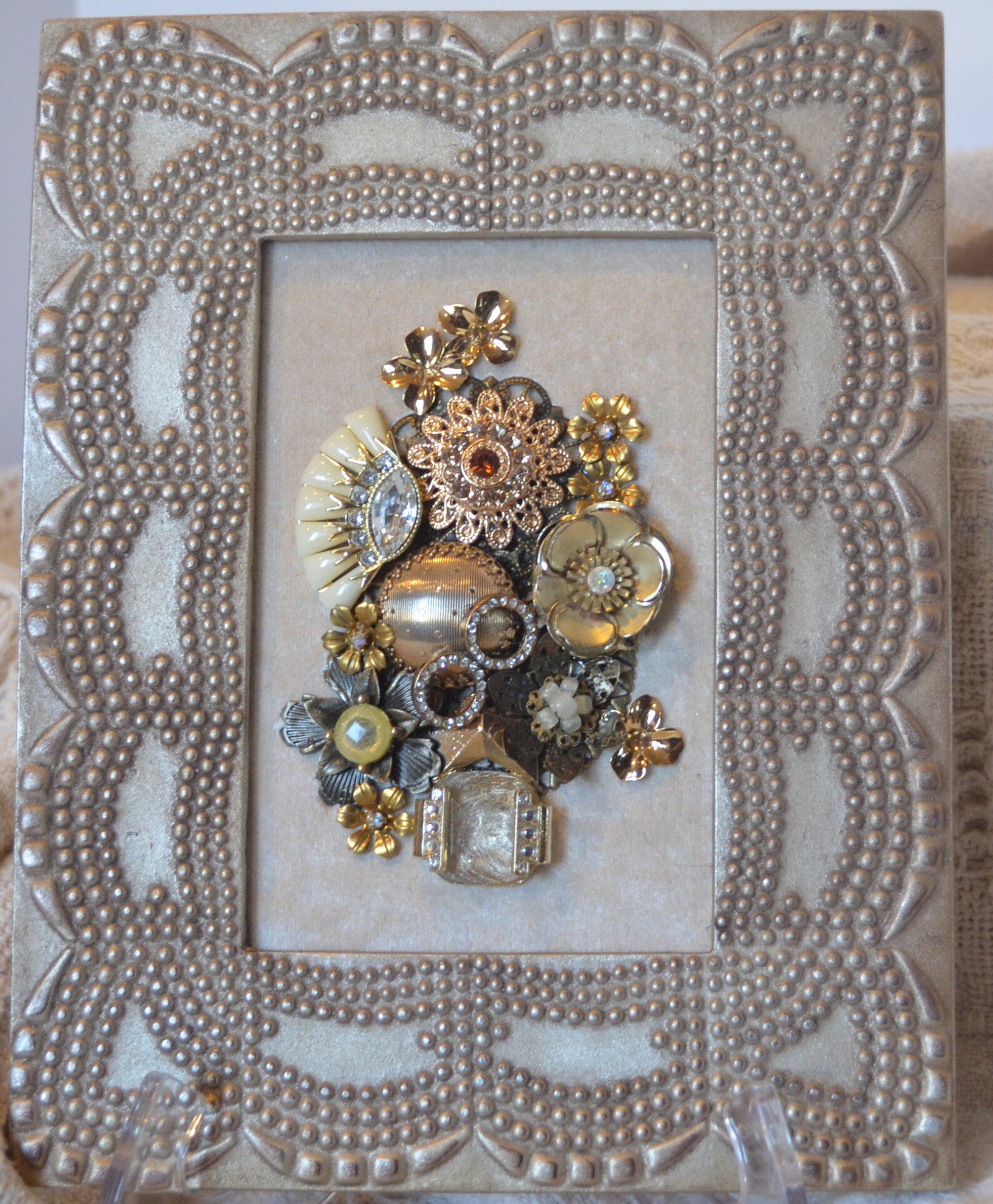 - Next go around the edge with small pieces and fill in with small stones or whatever vintage jewelry pieces you have.