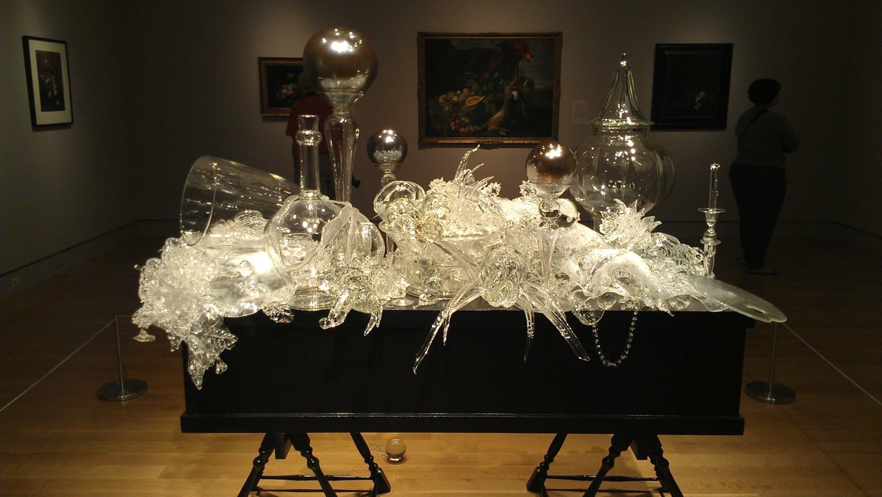 Envision this – you enter an art gallery and wander through the usual exhibits. You then find yourself in the more secluded part of the museum, the part that some people might not even realize exists. You walk into a room, where a dramatically lit still life waits for you. The light dances off dozens of pieces of clear glass – intricate sculptures of fruit, flowers, candlesticks, wine glasses, bowls and more. Everything is set atop a black rectangular box. Upon closer inspection, you might realize that the box is a casket. The wall text accompanying the piece informs you that the casket was custom-made to fit the artist herself.