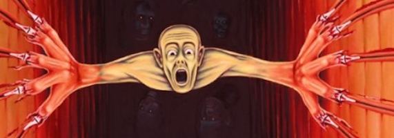 “Nearer My God to Thee” is one such piece that illustrates this anguish and points to its source. The title of the painting is a reference to a popular Christian hymn which declares that life’s trials and joys are but stairways to heaven — all earthly experiences are vectors by which one can come ever closer to God. Kevorkian’s take on this perspective is filled with doubt and fear — perhaps his patients’ as well as his own. In this painting, we see the reverse imagery of the hymn — instead of stepping buoyantly to heaven, the central figure seems to be slipping into hell, with a painful effort to resist the descent. Perhaps Kevorkian means to describe the personal hell created by resisting the inevitable (in this case, death itself?), as well as the existential deathbed crisis that many superficially or culturally religious people face during their dying time. (Other paintings that illustrate this widespread spiritual crisis in America include “For He Is Raised” and “Fa La La La La, – La La, – La, – LA!“) This crisis summons questions like, “What happens to me after I die?” and “Was I a good enough person to deserve heaven?” and “Does heaven exist? Does hell exist? Is there any continuance or comfort beyond my present hell-state of worldly suffering?”