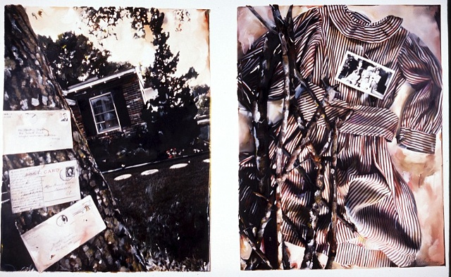 After the silver print is made, I build upon each print by using various art mediums such as painting, drawing, and image transfers. Often, multiple photographs are juxtaposed together to evoke narratives connecting one image to another, not unlike chapters in a book. Frequently, I incorporate hand or machine-sewn verses or writing into select areas of the print to act as dialog. The writings, both from personal journals and verses from popular 20th century poets, push the narrative capabilities of the image. All of my finished pieces are distinctive works on paper that move beyond the boundaries of a traditional photograph and challenge the viewer to discover the story being told.